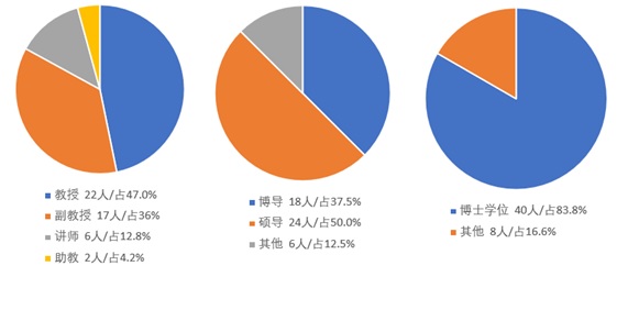 本学位授权点现有专任教师48人,其中教授22人,占47.0%,副教授17人,占36%,讲师6人,占12.8%,助教2人,占4.2%;博士生导师18人,硕士生导师24人(不含博士生导师);博士学位40人,占比85.1%,100%具有硕士学位。在2年建设期间,新增教授2人,新增副教授2人,新增博导4人,新增硕导5人。