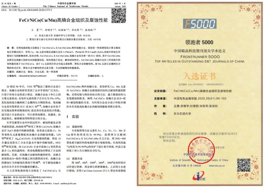 近日,科技部中国科学技术信息研究所发布了2023年度“领跑者”5000—中国精品科技期刊顶尖学术论文(F5000)入选论文名单,我院高胜教授指导学生发表在《焊接学报》的学术论文“马鞍形焊缝焊接机器人设计与建模分析”和王勇教授指导学生发表在《中国有色金属学报》的学术论文“FeCrNiCo(Cu/Mn)高熵合金组织及腐蚀性能”入选。