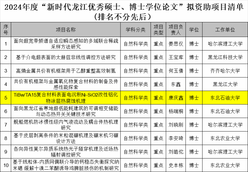 近日,黑龙江省教育厅正式公示了2024年度"新时代龙江优秀硕士、博士学位论文"拟资助项目名单。我校7位学者获资助(重点项目3项,一般项目4项),其中我院青年教师康庆鑫的博士论文《TiBw/TA15复合材料表面电沉积Ni-SiO2改性铝化物涂层热腐蚀机理》成功获批自然科学类重点项目资助。