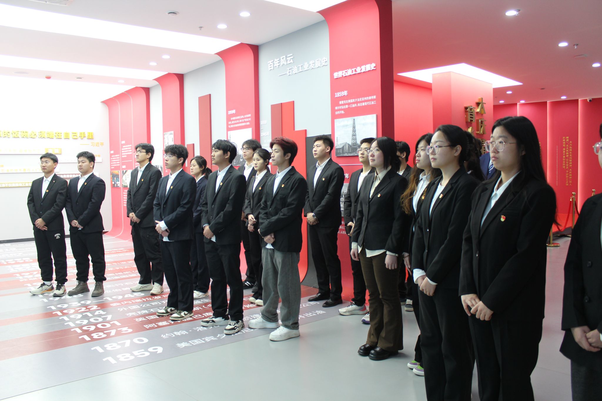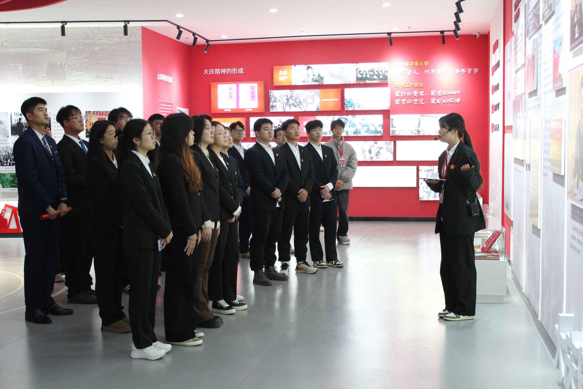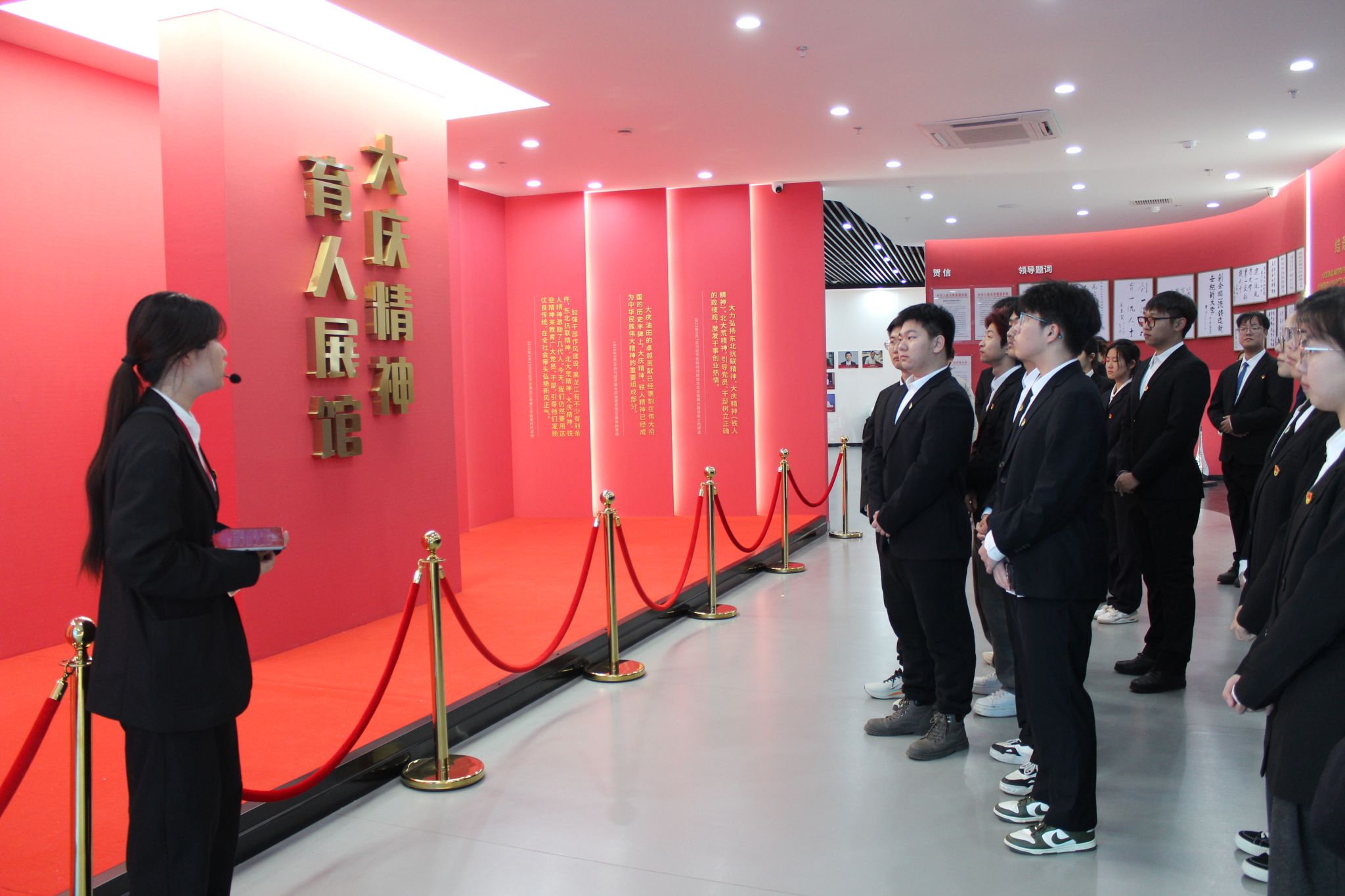 在大庆精神育人展馆内,讲解员全程细致讲解,通过珍贵的史料、生动的场景再现,全方位展现了铁人王进喜同志的奋斗历程,深入解读了铁人精神的形成背景、丰富内涵与时代价值。副校长李伟和党员们认真聆听、驻足凝视,在沉浸式研学中深刻感悟铁人精神的磅礴力量,进一步深化了对红色精神的认知与理解。