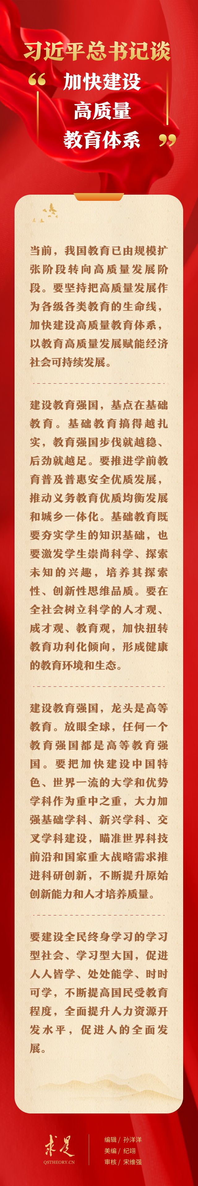 2023年9月16日出版的第18期《求是》杂志刊发习近平总书记重要文章《扎实推动教育强国建设》。在这篇重要文章中,总书记从“培养担当民族复兴大任的时代新人”、“加快建设高质量教育体系”、“全面提升教育服务高质量发展的能力”、“在深化改革创新中激发教育发展活力”、“增强我国教育的国际影响力”、“培养高素质教师队伍”6个方面,对扎实推动教育强国建设提出明确要求。